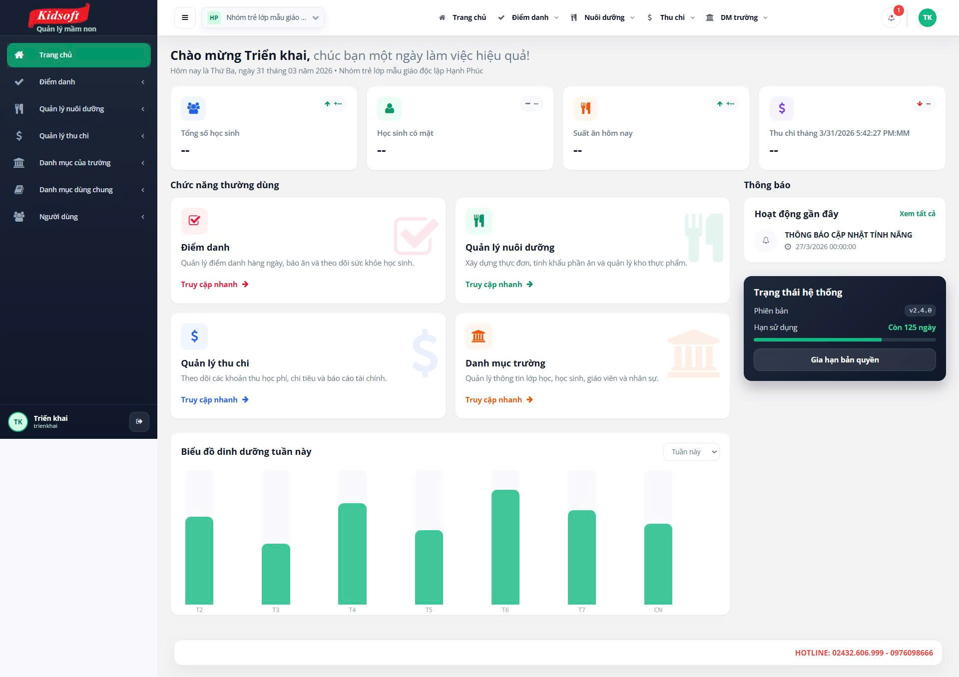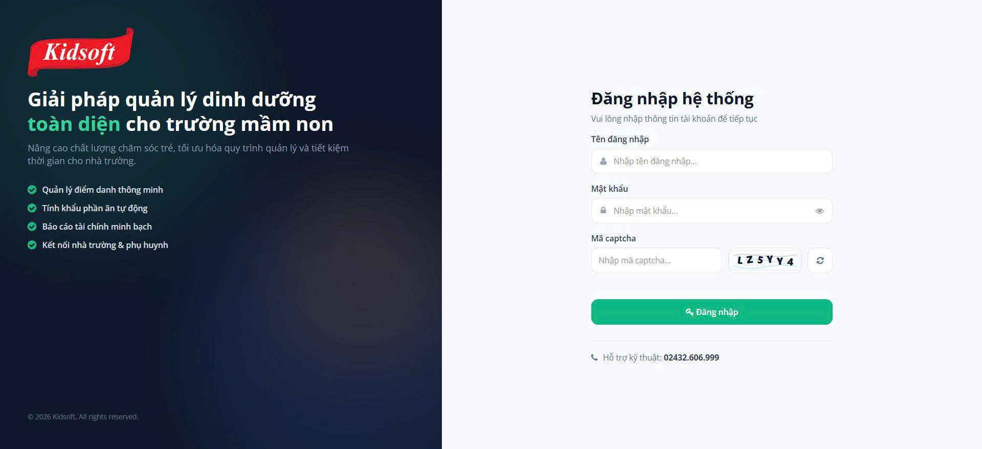 Kidsoft Online 2026 là phiên bản nền tảng web (cloud) của phần mềm dinh dưỡng Kidsoft, cho phép các trường học quản lý khẩu phần ăn, thực đơn và hoạt động nuôi dưỡng hoàn toàn trực tuyến, không cần cài đặt phần mềm trên máy tính. Hệ thống đã tích hợp nhiều công nghệ mới trong quản lý dữ liệu cũng như tích hợp công nghệ AI vào để phân tích số liệu hỗ trợ người dụng trong nhập liệu cũng như tư vấn tích toán xây dựng thực đơn, thành phầm dinh dưỡng một cách nhanh và chính xác nhất.